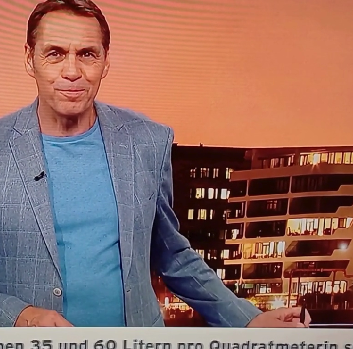 Un présentateur allemand sur la chaine de télévision RBB (Berlin) fait la présentation de son journal télévisé, il se tient debout, un stylo à sa main gauche.